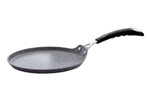 Elegantní černá pánev na palačinky s vnějším tepaným povrchem.