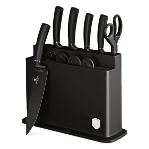 - Materiál: nerezová ocel s černou nepřilnavou vrstvou- Krájecí deska 4 ks- Černý stojan- Nůž na chléb 20 cm- Kuchařský nůž 20 cm- Krájecí nůž 20 cm- Užitkový nůž 12,5 cm- Nůž na okrajování 9 cm- Nůžky- …