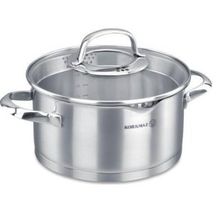 Celonerezový nízký hrnec s pokllicí se zesíleným třívrstvým akumulačním dnem.