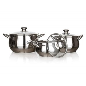 Sada nerezového nádobí RONDEL 6 ks obsahuje: hrnec 16 x 10,5 cm s poklicí, hrnec 20 x 12,5 cm s poklicí, hrnec 24 x 14 cm s poklicí.