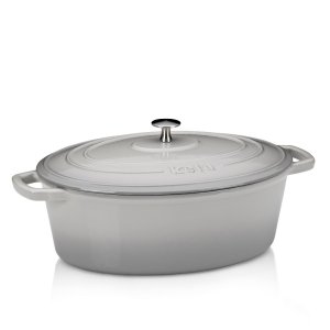 Ze série kela Calido: Oválný pekáč v šedé barvě s lesklým povrchem a víkem je dlouhý 33 cm, široký 26 cm a má objem 6,0 litrů.