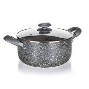 Hrnec 24 x 11 cm, nepřilnavý povrch, GRANITE, se skl. poklicí. průměr: 24 cm výška: 11 cm Hliníkový presovaný kastrol GRANITE. - nepřilnavý 2vrstvý povrch - granitový dekor - šedé silikonové úchyty - …