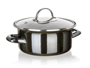 Hrnec + skleněná pokice, pr. 18 cm, 1,3 l, METALLIC Black. průměr: 18 cm výška (bez poklice): 8 cm objem: 1,3 l černá metalíza Smaltovaný hrnec METALLIC Black se skleněnou poklicí.