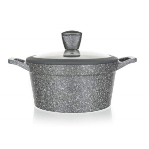Hrnec 24 x 11 cm, nepřilnavý povrch, GRANITE, se skl. poklicí. průměr: 24 cm výška: 11 cm Hliníkový presovaný kastrol GRANITE. - nepřilnavý 2vrstvý povrch - granitový dekor - šedé silikonové úchyty - …