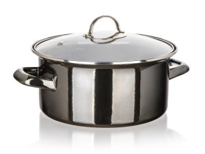 Hrnec + skleněná pokice, pr. 22 cm, 3,7 l, METALLIC Black. průměr: 22 cm výška (bez poklice): 13 cm objem: 3,7 l černá metalíza Smaltovaný hrnec METALLIC Black se skleněnou poklicí.