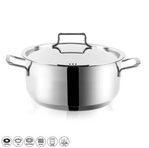 Celonerezový nízký hrnec s pokllicí se zesíleným třívrstvým akumulačním dnem.