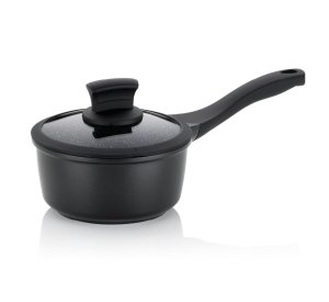 Hliníkový litý kovaný rendlík se skleněnou poklicí, PREMIUM DARK BROWN s nepřílnavým povrchem, rozměr 16 x 7,5 cm, tmavě hnědý granitový dekor, tloušťka stěny 3 mm, plně indukční dno, soft-touch rukojeť …