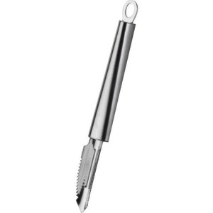 Moderní a velmi účinná nerezová škrabka na zeleninu se zubatým ostřím.