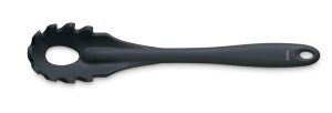 Z praktické řady kuchyňských potřeb Tom: Lžíce na špagety ze silikonu v černé barvě s praktickou, spíše plochou rukojetí a celkovou délkou 28,5 cm.