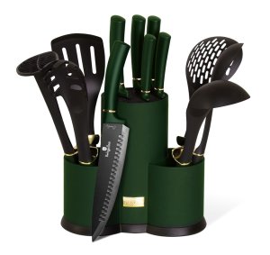 - dokonale praktická sada celkem 12ti kusů kuchyňského vybavení a nožů ve stojanu s brouskem - stojan je navržen jako blok na nože se sloty na 6 kuchyňských nožů, přihrádkou na kuchyňské náčiní, vařečky, …