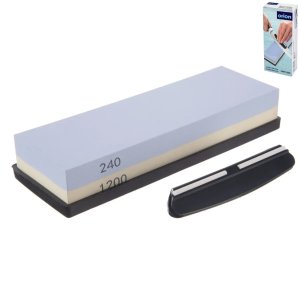 Kvalitní kombinovaný brusný kámen se silikonovou protiskluznou podložkou a s vodicí svorkou s keramickými válečky.