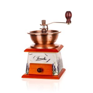 Ruční mlýnek na kávu s keramickým mechanismem, dekorované keramické tělo s dřevěnými doplňky a kovovou násypkou, keramickou mlecí mechaniku lze nastavit na požadovanou hrubost mletí.