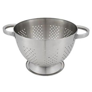 Nerezový cedník s ručkou a dvěma očky k zavěšení na hrnec.
