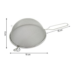 Kvalitní pevný nerezový cedník s ručkou, průměr 16 cm, výška 6 cm, délka s ručkou 32 cm, délka háčku 3 cm.