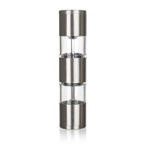 Mechanický mlýnek na sůl a pepř CULINARIA Duo je dodáván v nerezovém provedení, zásobníky jsou akrylové.