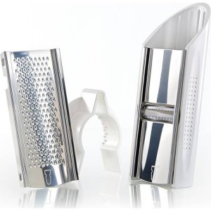 Struhadlo na různé druhy zeleniny a ovoce vyrobené z vysoce kvalitní nerezové oceli v bílo-stříbrné kombinaci.