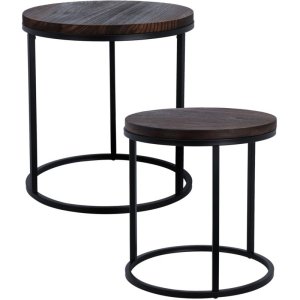 Sada 2 stolků.Materiál: dřevo, kovRozměry:- průměr 43 cm, výška 45 cm- průměr 38 cm, výška 40 cm- tloušťka dřevěné desky 2,2 cm