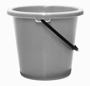 Plastový bílý kbelík s víkem s pojistkou a uchem pro přenášení.