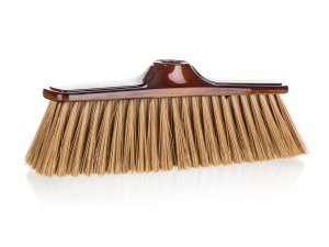 Plastový smeták s jemným třepením konců štětin v imitaci dřeva.