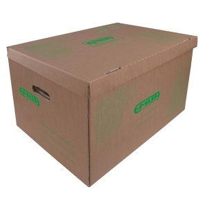 Stěhovací kontejner vyrobený z mimořádně kvalitní třívrstvé vlnité lepenky se zeleným potiskem Odklápěcí víko Určený pro přenášení objemných dokumentů či předmětů Vhodný pro archivaci dokumentů formátu …