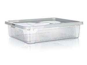 Nízká krabice s víkem a kolečky pro snadnou manipulaci, transparentní plast.