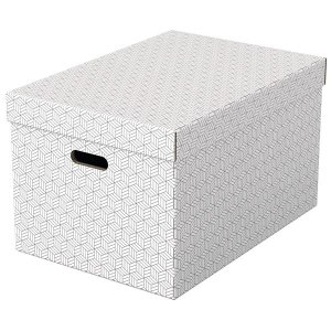 Sada tří velkých lepenkových úložných boxů s moderním a stylovým geometrickým designem Ideální pro ukládání dokumentů, pákových pořadačů, hraček, knih a dalších větších věcí Lze použít samostatně nebo …