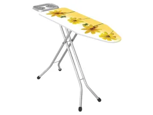 Žehlicí prkno s pevnou konstrukcí a odkládací kovovou plochou pro žehličku.