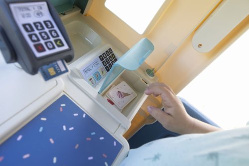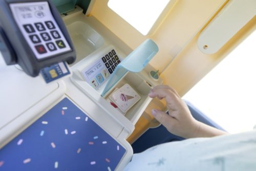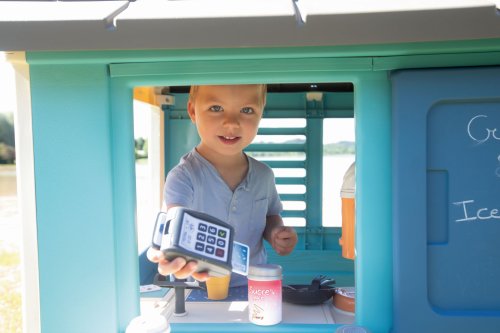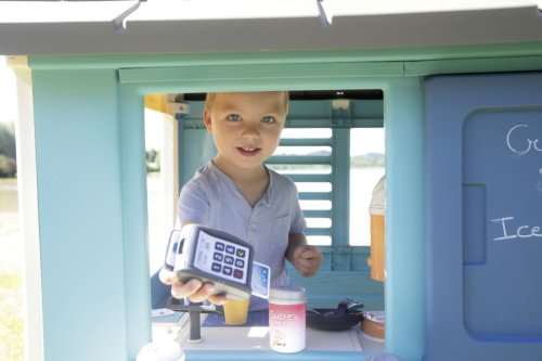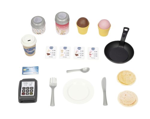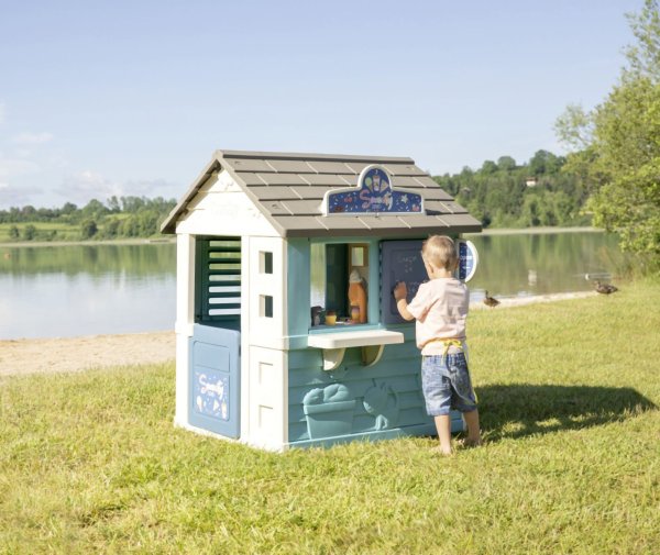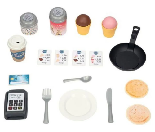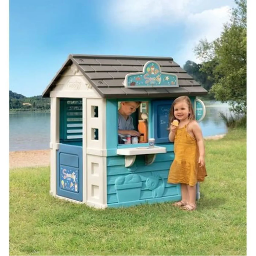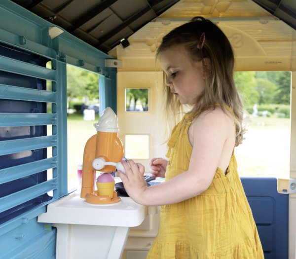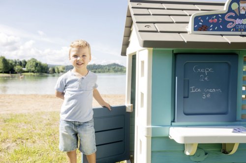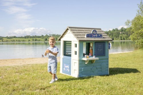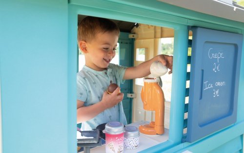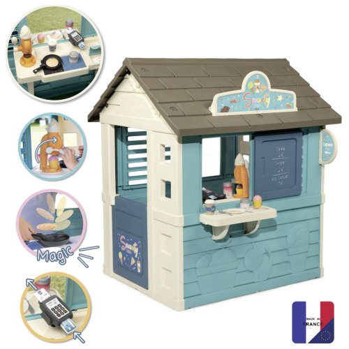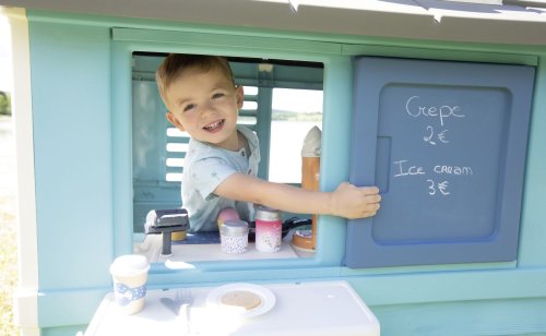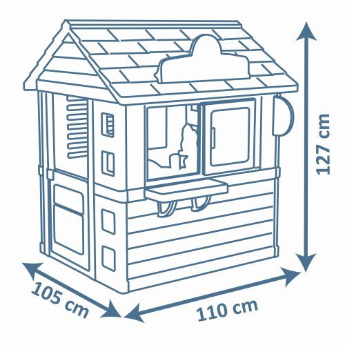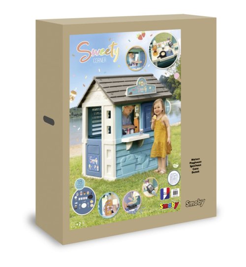 Stabilní, prostorný domeček Sweety Corner s výdejním okénkem pro dobroty sebou. S polovičními vstupními dveřmi , 2 okny s okenicemi, které lze posouvat a využít k napsání jídelníčku. Domeček má pult pro příjem objednávek od zákazníků a ve vnitřní straně má pult pro přípravu palačinek, zmrzliny a nápojů. Součástí je 18 ks příslušentsví, např. talířek, vidlička, nůž, 2 palačinky, cukřenka, pokladní doklady, kreditní karta atd. Vyrobeno z kvalitního, pevného, UV záření odolného plastu, snadné sestavení. Rozměry domečku (DxŠxV): 105 x 110 x 127 cm.