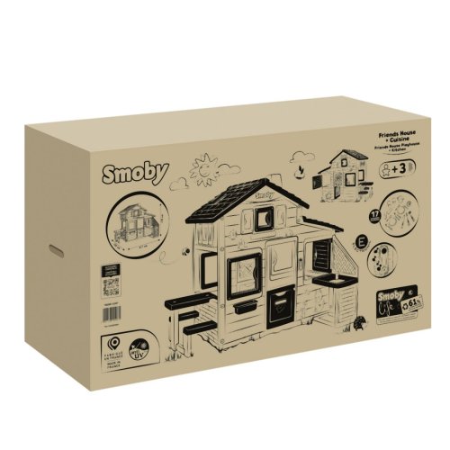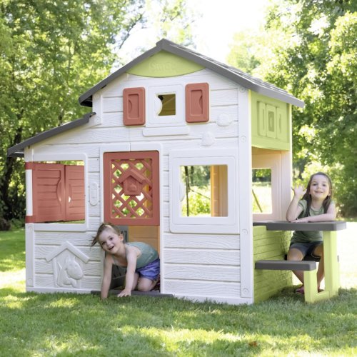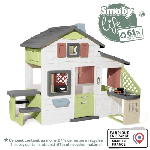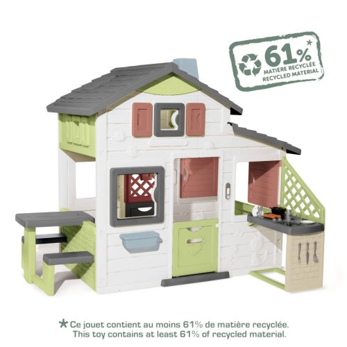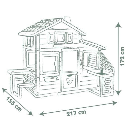 Prostorný domeček s funkčním zvonkem má 2x vrátka, 6 oken, odnímatelný piknikový stůl s lavicemi a letní kuchyň s příslušenstvím. Lze rozšířit o další herní prvky. Ochrana proti UV záření. Tento výrobek osahuje 61 % reyklovaného materiálu. Výška dveří od země 46,3 cm. Rozměry: 217 x 172 x 155 cm.