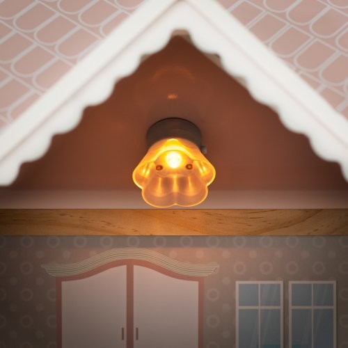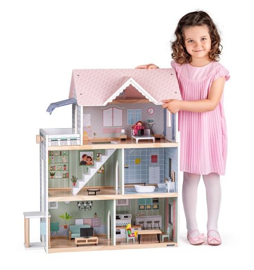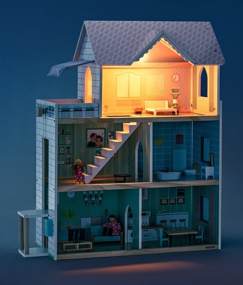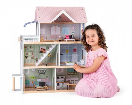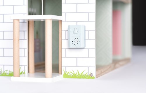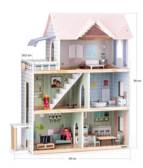 Kvalitní třípatrový domeček pro panenky dodáváme včetně zobrazeného příslušenství (17ks). Nábytek je vyroben z kombinace materiálů dřevo/ plast. Z přízemí do prvního patra se mohou panenky svézt výtahem. U vchodu je umístěn domovní zvonek. Třetí patro je vybaveno nejen prostornou terasou a markýzou, ale i funkčním světlem.| Věk: 3+ | Rozměry: 63,5 x 31 x 80 cm | Baterie: 2x CR2032 nejsou součástí balení.