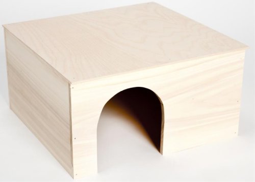 Prostorný domek z kvalitní překližky, bezpečné pro drobné savce (překližka s certifikátem pro výrobu dětského nábytku). Dostatečně prostorný vchod a prostor uvnitř domku. Rovná střecha domku slouží jako patro, poskytuje prostor navíc. Rozměry: šířka 37 cm, hloubka 37 cm, výška 25 cm