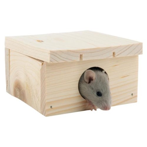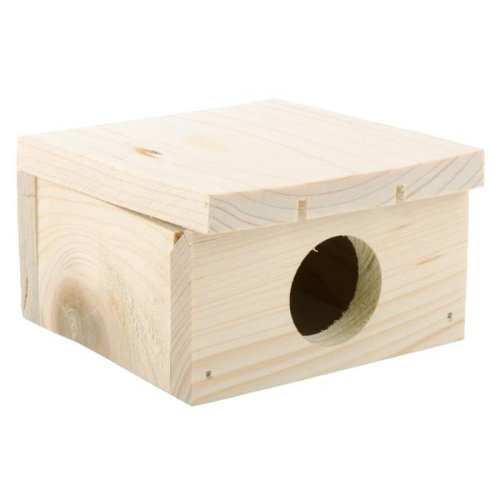 Domek z měkkého neošetřeného dřeva s rovnou střechou. Velmi snadná údržba uvnitř domečku. Domeček nemá dno, takže ho stačí pouze odklopit a místo pod ním vyčistit. Svojí velikostí je vhodný především pro křečky, křečíky a myši. Rozměry: 10 x 10 x 6 cm