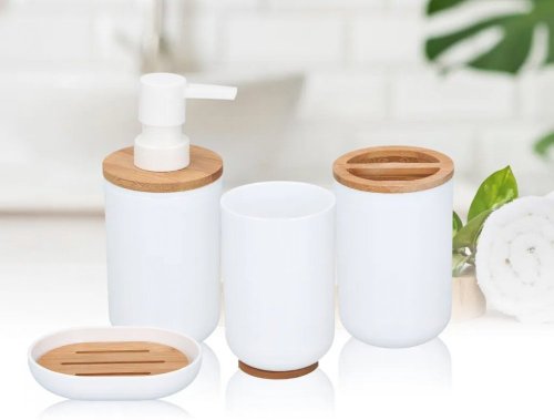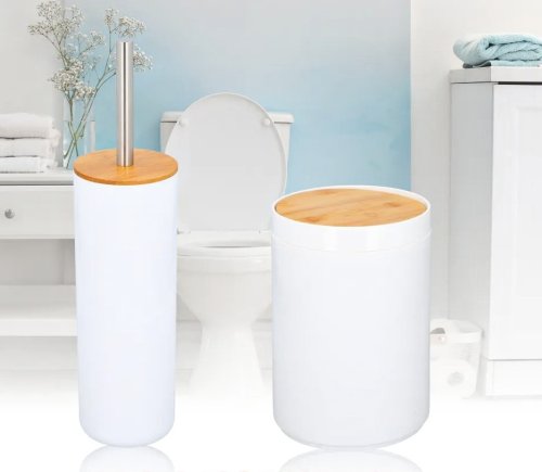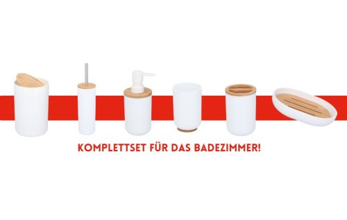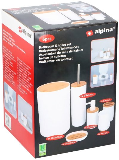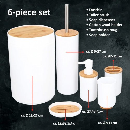 Sada doplňků do koupelny:Tato krásná 6dílná sada od Alpiny je vyrobena v bílé barvě s bambusovými detaily. Dřevěné detaily vytvářejí elegantní design, který se hodí do každé místnosti.Set se skládá z kbelíku, WC kartáče, dávkovače mýdla, držáku na zubní kartáčky, misky na mýdlo a hrnku. Jedním nákupem tak získáte 6 užitečných kousků do vaší koupelny.