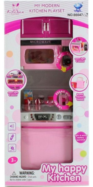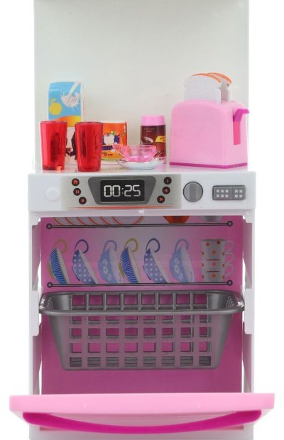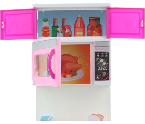 Plastový nábytek pro panenky. Kuchyňská linka s mikrovlnkou a myčkou o rozměru 10 x 31 x 7 cm. Linka má otevírací dvířka a součástí je plastové nádobí a toustovač s vyskakujícími tousty. Mikrovlnka svítí a vydává zvuky. Napájení baterie 3x LR44 (jsou součástí balení).