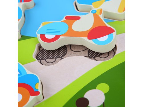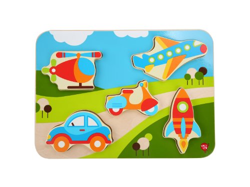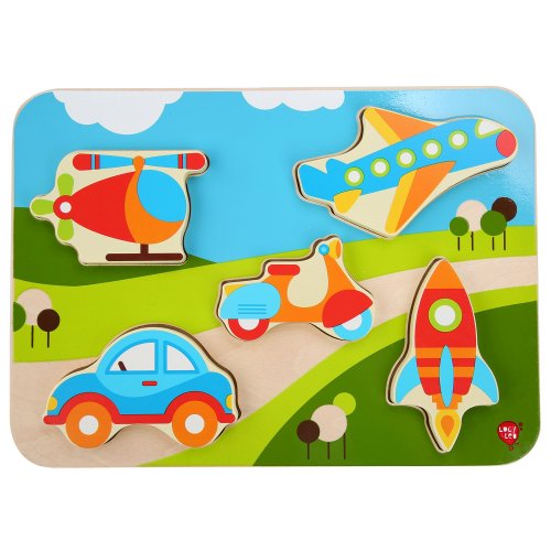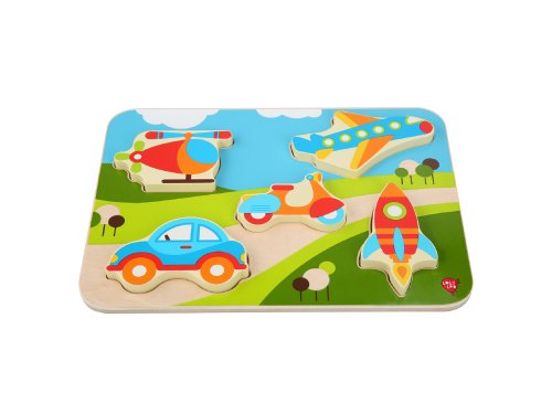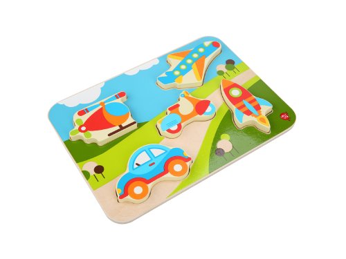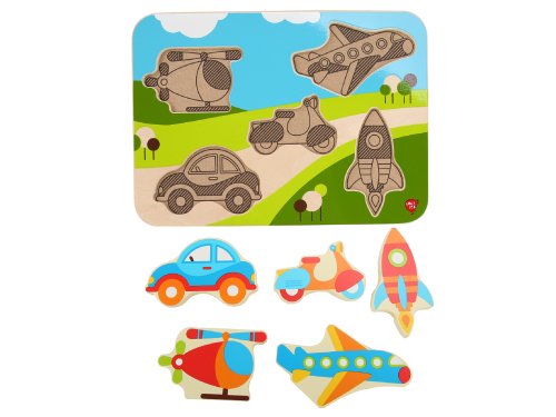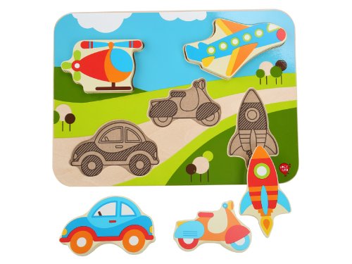 Dopravní prostředky je dřevěné vkládací puzzle bez úchytek s motivem aut a dalších dopravních prostředků, které potěší nejen malé kluky. Na hladké barevné desce jsou nakresleny různé dopravní prostředky. Pět vystouplých dřevěných tvarů dopravních prostředků lze jednoduše uchopit a vložit do správných vyfrézovaných drážek na barevnou desku. Díly jsou velké, krásně ilustrované a dětem se díky své velikosti berou dobře do ruky. Tvar a tloušťka jednotlivých dílků umožňuje některým dopravním prostředkům i samostatně stát. Na této vkládačce si děti procvičí jemnou motoriku, prostorovou orientaci a v neposlední řadě trpělivost. Výška desky 21 cm, délka 29 cm, délka dopravního prostředku cca 10,5 cm, tloušťka cca 1 cm.