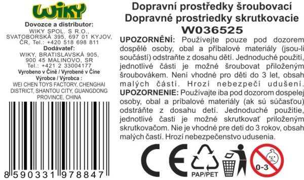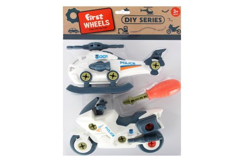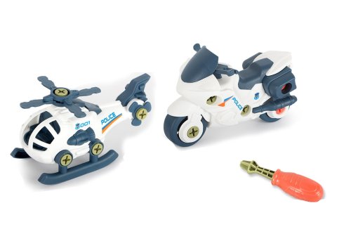 Dopravní prostředky šroubovací. Velikost 15,5 cm. Obsah balení - helikoptéra, motorka, šroubovák.