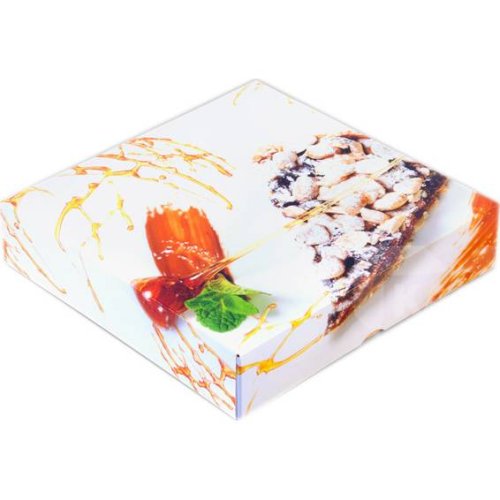 "Krabice s barevným potiskem na rolády, dorty, zákusky, cukroví a různé další cukrářské výrobky z velmi kvalitního pevného papíru. Rozměry: 23 x 5 cm".