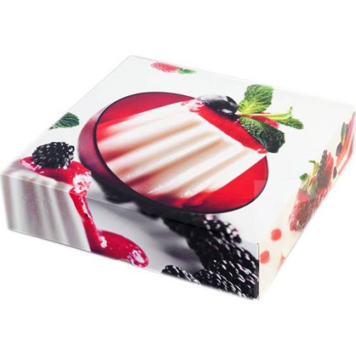 Krabice z tvrdého potištěného papíru na větší dorty, případně větší množství zákusků nebo cukroví.