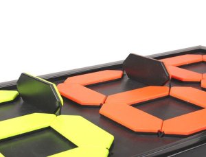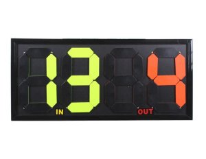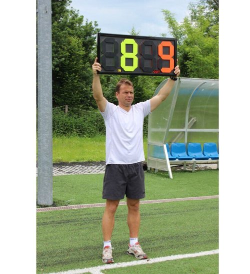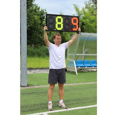 Oboustranná mechanická tabule pro střídání Merco Double je velmi oblíbená mezi trenéry a fotbalovými kluby. Ovládání tabule je velice jednoduché pomocí systému gumiček. Výhodou tohoto modelu je, že z obou stran je možné vidět kdo jde do hry a kdo ven. Číslice jsou velmi dobře viditelné i z větších vzdáleností a to díky světlé žluté a oranžové barvě. Celkové rozměry ukazatele jsou přibližně 84 x 38 x 2 cm. Tato mechanická tabule patří do základních modelů. Pokud hledáte profesionálnější tabule pro střídání, nabízíme také LED elektronické tabule.