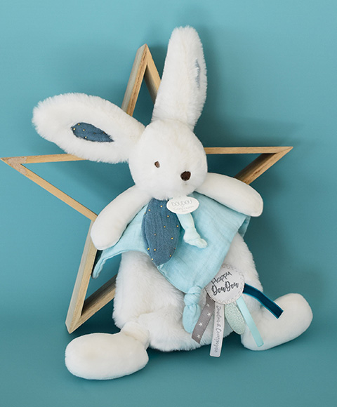 Měkký králíček se rychle stane oblíbeným společníkem Vašeho dítěte. Krásný, stylový s bambulkou v modré barvě, zdobený efektními, dovedně sladěnými tkanými stuhami. Je posazený do nádherné dárkové krabičky s grafikou evokující modernost i luxus. Tato plyšová hračka je také ideální jako dárek. Údržba: Perte v lázni na 30°. Přirozené nebo nízkoteplotní sušení. Hlavní vlastnosti: měkký plyš, prémiový materiálv souladu s evropskými normami CEkamarád, polštářek, nebo také výzdoba dětského pokojevhodné od narození