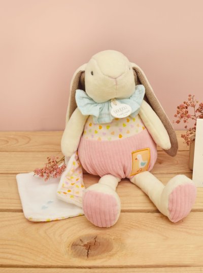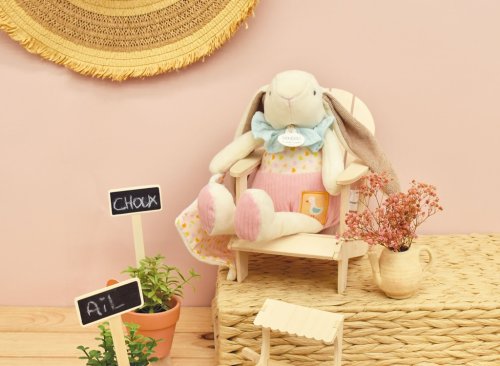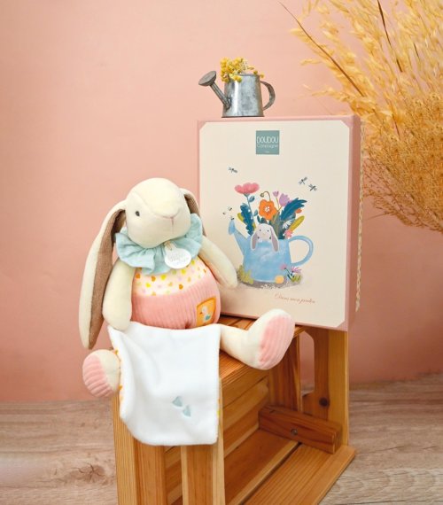 Králíček Ciboulette o velikosti 28 cm z kolekce „Moje zahrada“ je roztomilá hračka v anglickém stylu. Králík s dlouhýma měkkýma ušima má na sobě růžový manšestrový obleček s nášivkou husy, potištěné tričko se srdíčky a modrým límečkem. V tlapce drží malou dečku, která vybízí k mačkání a mazlení a dítě zabaví i uklidní. Králíček je zabalen v opakovaně použitelné dárkové krabičce pro uložení vzpomínek (fotografie a další připomínky narození miminka) a je krásným dárkem pro jakoukoliv příležitost. Kolekce hraček „In my garden“ – Moje zahrada je inspirovaná přírodou. Hračky jsou zabalené v pěkných dárkových krabičkách ilustrovaných akvarelem a připomínají různorodost a barvy zahrady, což je podtrženo i jejich jmény jako je Ciboulette (pažitka), Aneth (kopr) a další. ÚdržbaPerte v lázni na 30°. Sušte přirozeně nebo v sušičce při nízké teplotě. Hlavní vlastnosti: hračka s dečkouprémiový materiálpodporuje smyslový vývoj dítětev souladu s evropskými normami CEdárková krabička pro uložení vzpomínekvhodné od narození