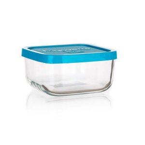 objem: 2 l rozměry: 19 x 19 x 8 cm materiál: sklo, polypropylenové víčko barva víčka: modrá