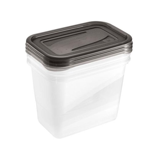 Praktická sada 3ks dóz na potraviny Fredo Fresh s víkem - objem 1l. Svěží moderní design, snadné otevíraní. Vhodné na uchovávání potravin, na obědy, svačiny apod. Díky těmto dózám uchováte potraviny déle čerstvé. Vhodné též do mrazáku. Rozměry - 15,5 x 10,5 x 11,5 cm. Barva - čirá s modrým víčkem.
