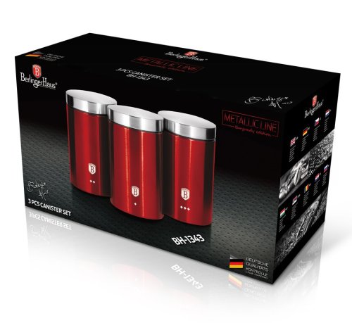 - sada 3 kusů designových dóz na potraviny z kolekce Burgundy Metallic Line- tělo i víko jsou vyrobené z nerezové oceli- určené především pro skladování suchých potravin- dózy jsou ideální na kávu, čaj, …