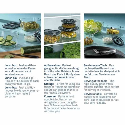 Všestranné použití: Díky kulatému tvaru je dóza vhodná zejména na saláty, omáčky, dipy, předkrmy a mnoho dalšího. Ideální pro skladování, přepravu a servírování.