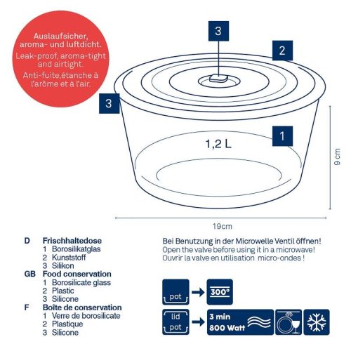 Vhodné do mikrovlnné trouby: Dózu lze s víkem používat v mikrovlnné troubě při výkonu 800 W po dobu až 3 minut. Ideální pro ohřívání jídla.