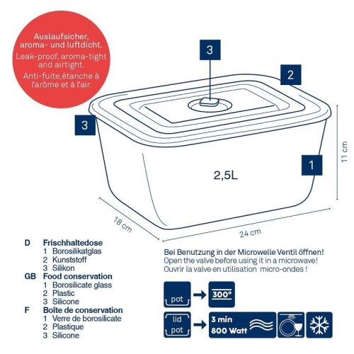 - Materiál:borosilikátovéh skla s víkem z MS plastu