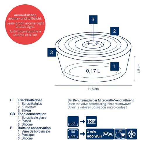 Vhodné do mikrovlnné trouby: Dózu lze s víkem používat v mikrovlnné troubě při výkonu 800 W po dobu až 3 minut. Ideální pro ohřívání jídla.