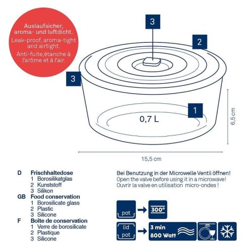 Vhodné do mikrovlnné trouby: Dózu lze s víkem používat v mikrovlnné troubě při výkonu 800 W po dobu až 3 minut. Ideální pro ohřívání jídla.