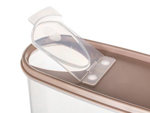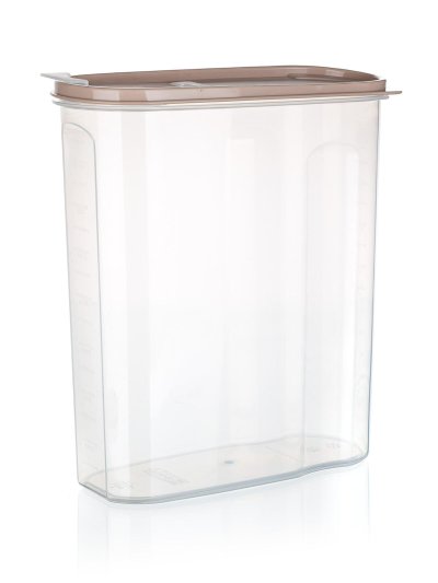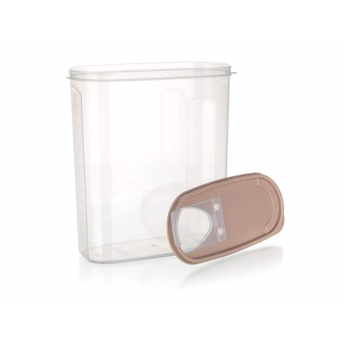 Transparentní plastová dóza RIVA s víčkem v hnědé barvě. Dóza je praktickým pomocníkem na ukládání těstovin, luštěnin, mouky a jiných potravin.